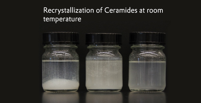 Ceramides are insoluble in emollients at 20 °C but they are soluble at elevated temperatures.